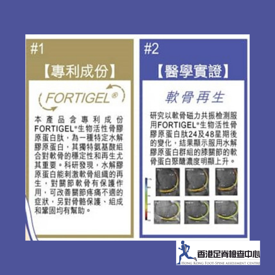 本產品含專利成份FORTIGEL®生物活性骨膠原蛋白肽,為一種水解膠蛋白,其獨特氨基酸組合對軟骨的穩定性和再生尤其重要。科研發研,水解膠原蛋白能刺激軟骨組織的再生,對關節軟骨有保護作用,可改善關節疼痛不適的症狀,另對骨骼保護、組成和鞏固均有幫助。